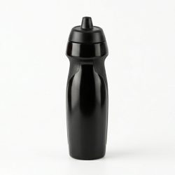 Botella plástica de cuerpo plástico traslúcido con tapa y base de acero inoxidable. Presentación en caja individual negra.