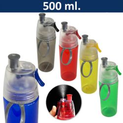 Botella con rociador en distintos colores. Boquilla y asa en color gris. Asa removible.