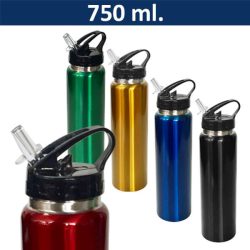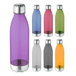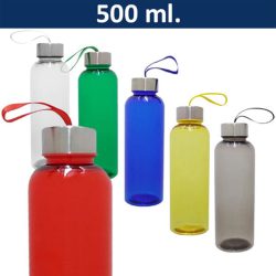Botella plástica traslúcida en distintos colores con tapa de acero inoxidable y cinta transportable del mismo color de la botella. Presentación en bolsa de regalo plástica con cinta amarre de color.