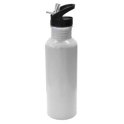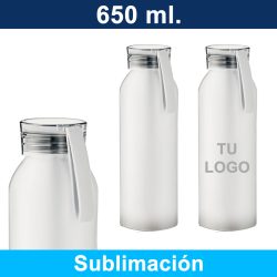 Botella blanca para sublimación de acero inoxidable SS201,con tapa rosca negra plástica y dosificador. Capacidad de 650 ml. Presentación en bolsa plástica dentro de caja de cartón negra.