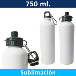 Botella blanca para sublimación de aluminio con tapa dosificador + tapa rosca negra y gancho mosquetón. Presentación en bolsa plástica dentro de caja de cartón blanca.