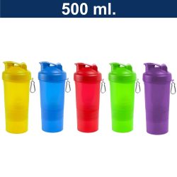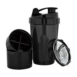 Vaso mezclador para batidos de suplementos. Incluye dos compartimientos en base enroscable, uno tipo pastillero y otro para polvo de suplemento alimenticio.