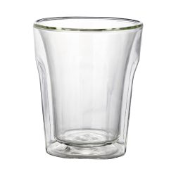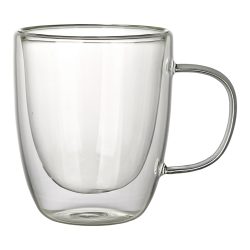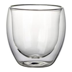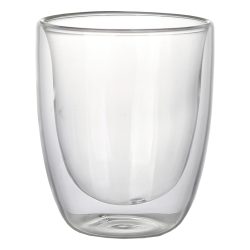 Taza de vidrio borosilicato doble capa. Presentación en plástico burbuja dentro de caja kraft.