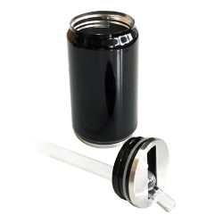 Mug doble pared metálico de cuerpo negro. Detalle en tapa y argolla en gollete del mismo color.