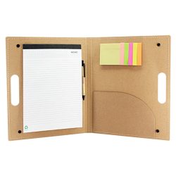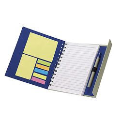 Incluye block de notas A4 de 20 hojas, 1 block de notas adhesivas de 25 hojas pequeñas, 5 blocks de 25 banderitas adhesivas, bolígrafo ecológico, tinta azul.