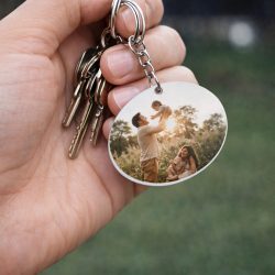 Llavero de bambú con forma redonda.