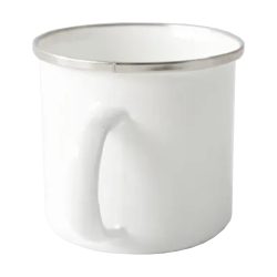 Mug enlozado lechero para sublimación con borde de acero inoxidable. Presentación en caja individual blanca.