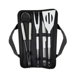 Set parrillero BBQ que incluye espátula, cuchillo parrillero, pinzas y tenazas.
