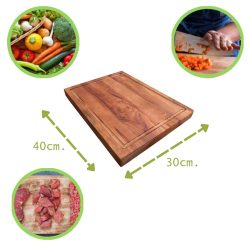 Por un lado sirve para picar carnes con ranuras laterales para excesos de líquidos. Por el otro lado es cóncava para servir verduras picadas, frutos secos, snacks, etc.
