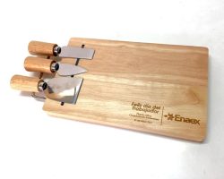 Tabla rectangular para picar quesos de madera con herramientas de acero inoxidable y madera roble. Tabla incluye asa transportable/colgable y banda magnética para herramientas.