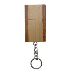 Pendrive llavero plegable de madera en dos colores. Capacidad de 16 GB. Presentado en caja de cartón reciclado.