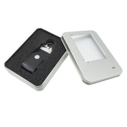 Pendrive ejecutivo símil cuero café con hebilla metálica. Capacidad de 16 GB. Presentado en estuche metálico con ventana traslúcida.