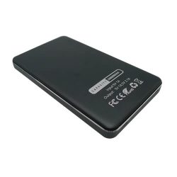 Batería externa rectangular metálica de aluminio en diferentes negro y gris con terminaciones plateadas. Capacidad de 10.000 mAh. Presentado en estuche de cartón negro con funda laminada del mismo color del artículo.