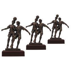 Trofeo de Resina con forma de jugadores pintado de color cobre. Incluye base de madera. Presentación en caja de cartón con interior de aislapol.