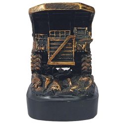 Trofeo de resina grande con forma de camión minero encobrizado. Presentación en caja de cartón blanca.