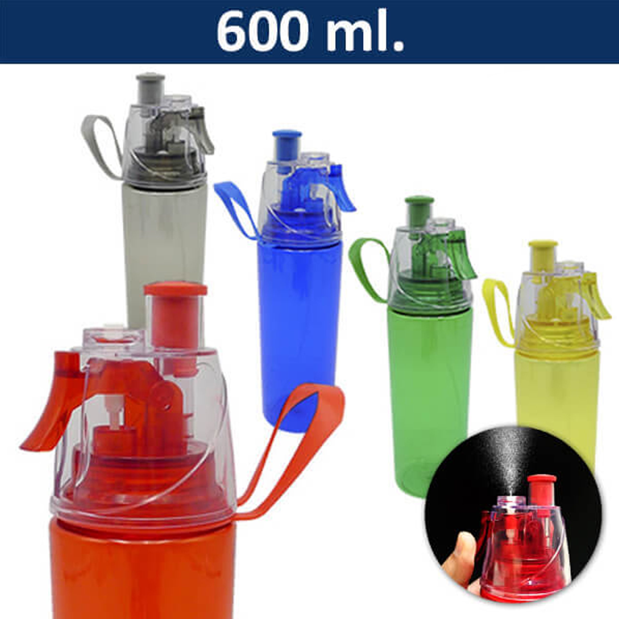 Botella con rociador en distintos colores. Boquilla y asa en color gris. Asa removible.