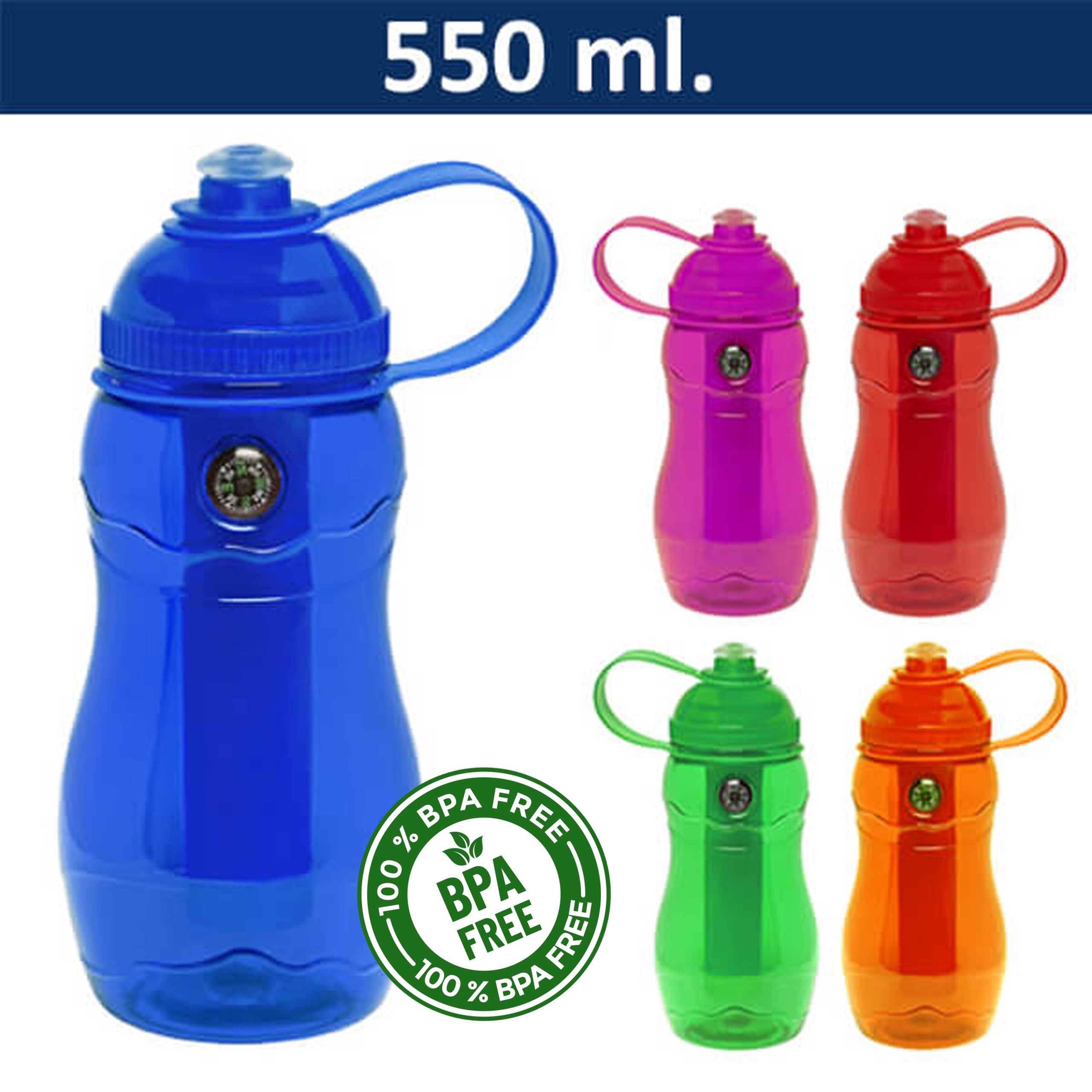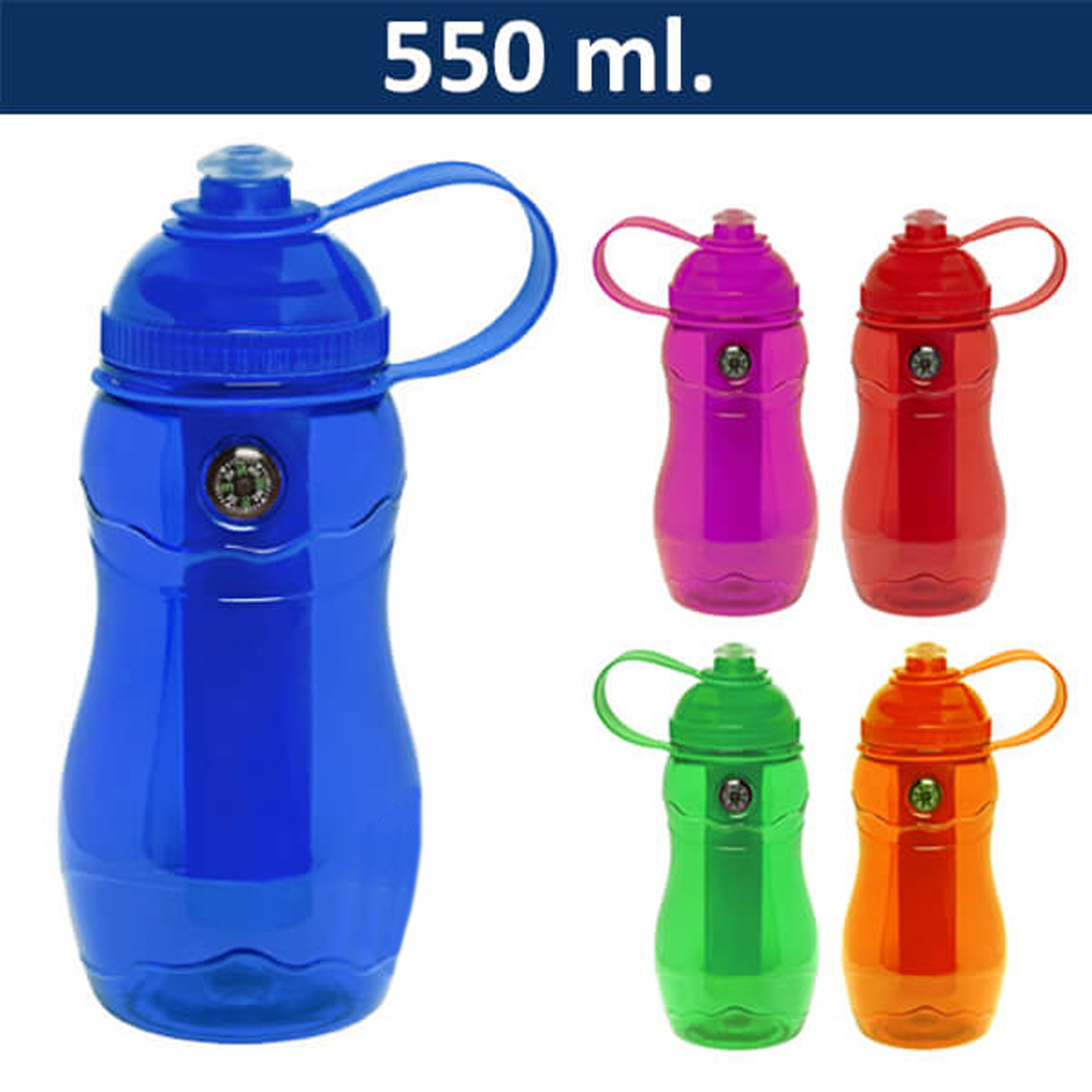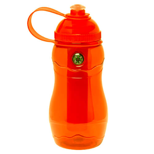 Caramayola plástica con cilindro extraíble de material cooler para refrigerar líquidos. Tapa rosca y boquilla deportiva de goma. Incluye brújula incrustada.  Presentación en bolsa plástica dentro de caja de cartón negra.