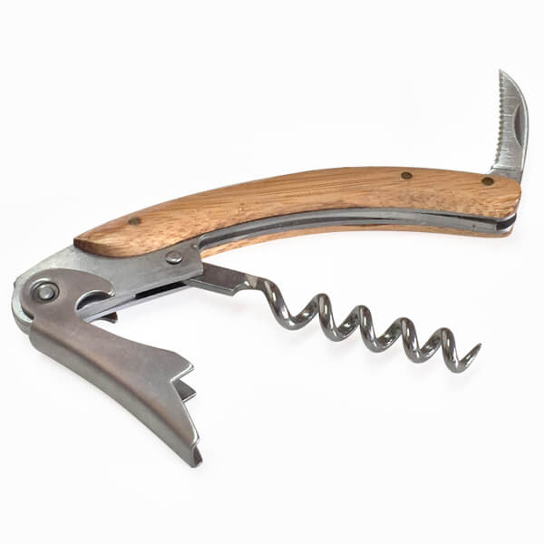 Multi-herramienta de bambú con sacacorchos, destapador y cuchilla para abrir sellos, en estuche de madera bambú con cierre magnético.