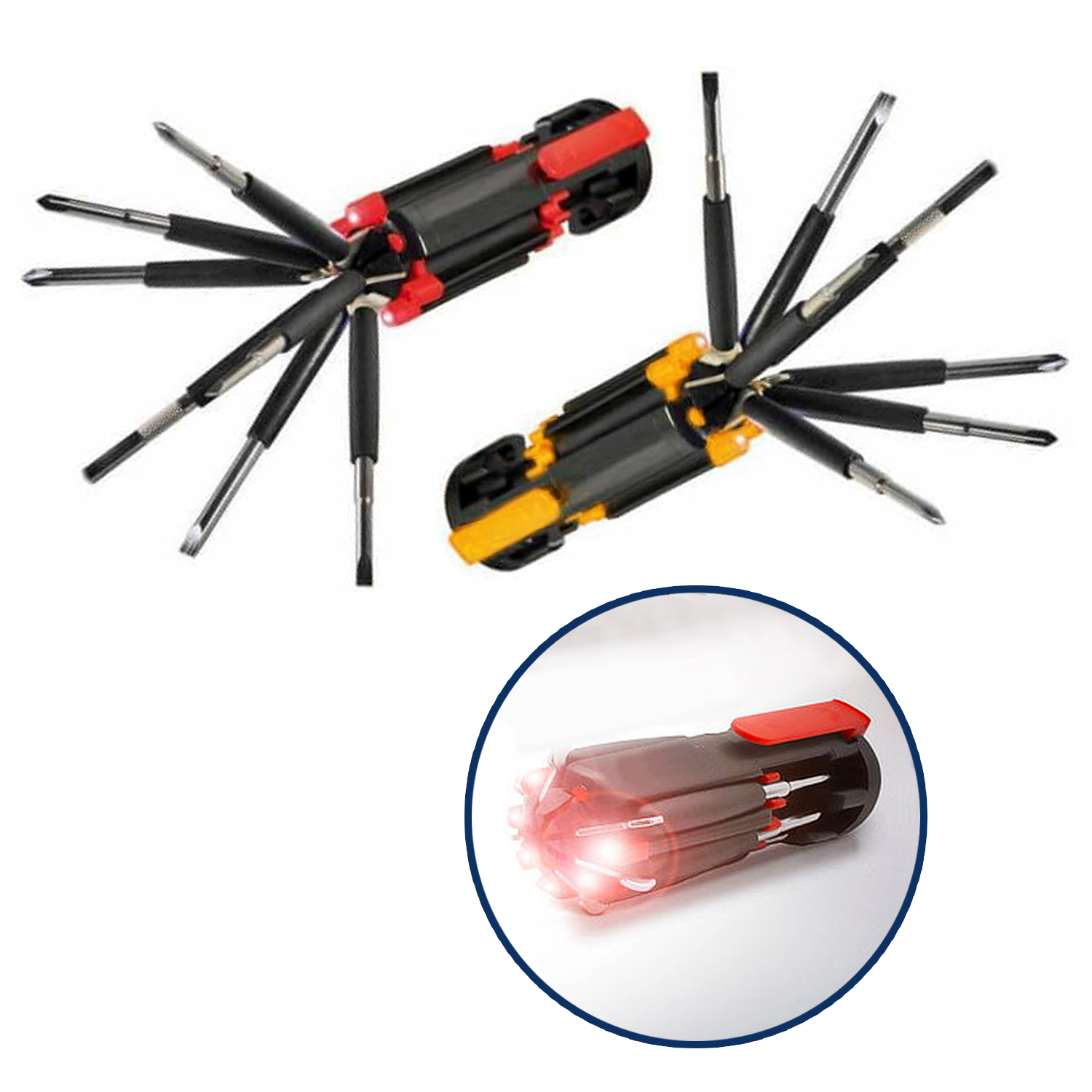 Destornillador linterna 6 en 1. Cuerpo negro y detalles de color rojo, linterna con 4 luces LED, 5 puntas de destornillador y clip sujetador de plástico.