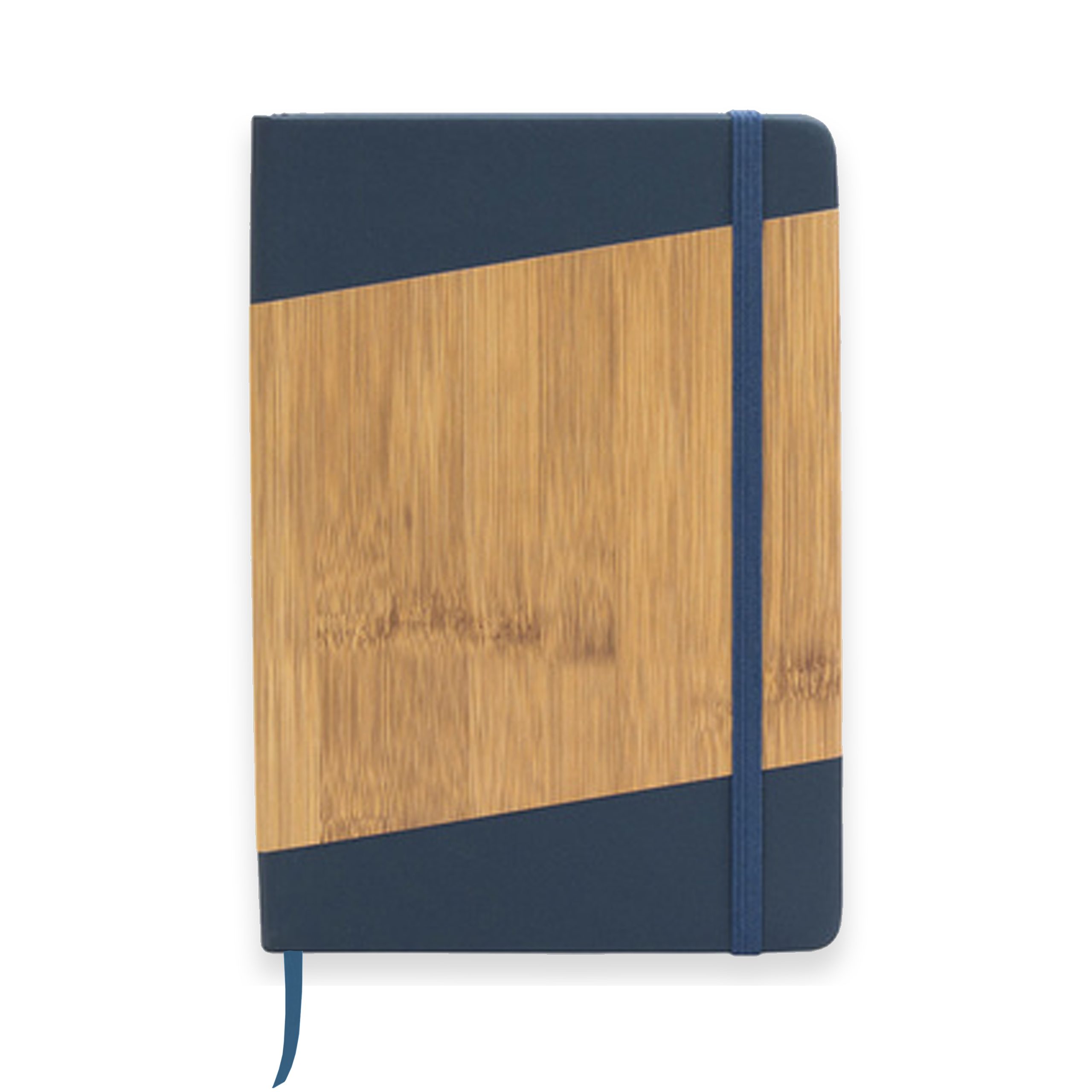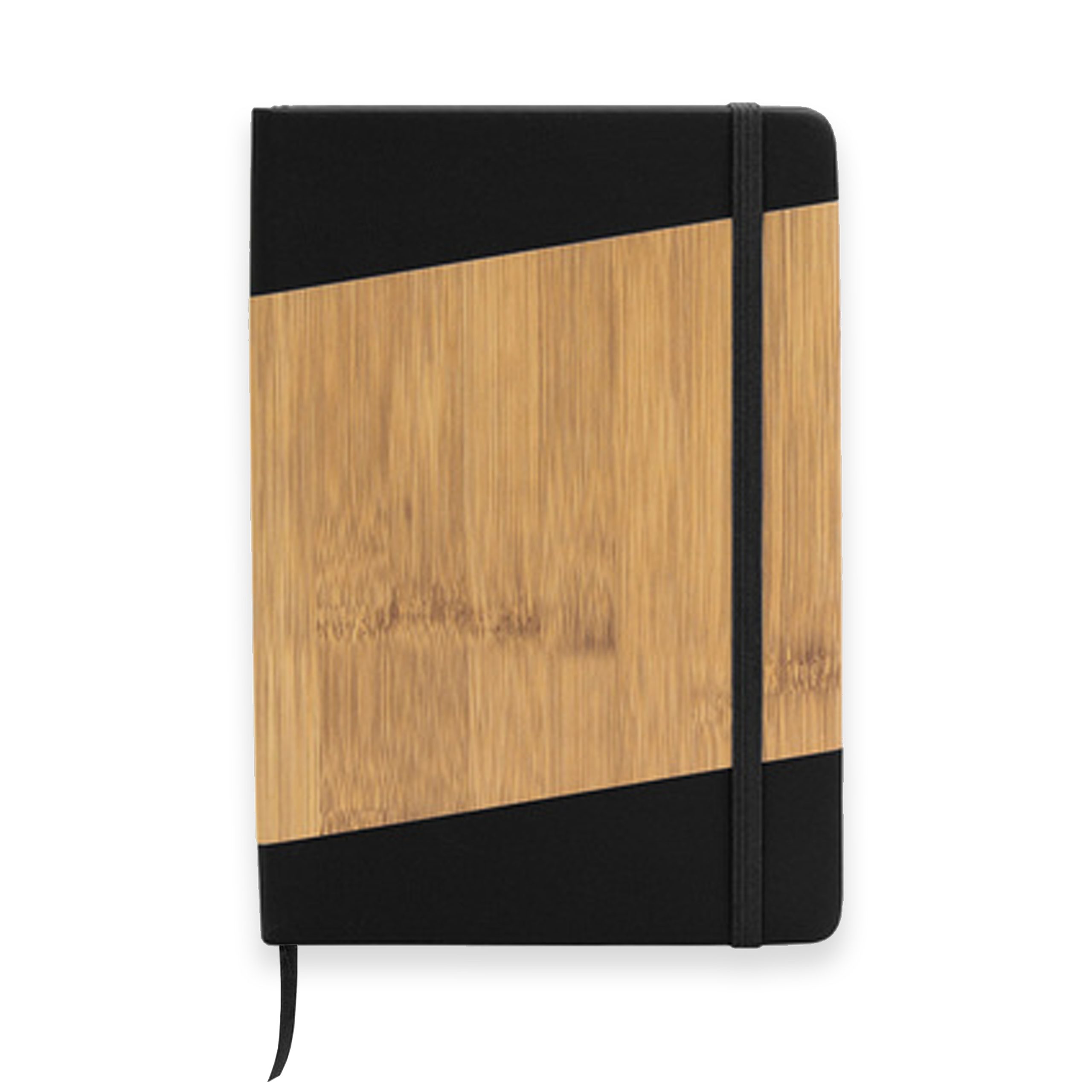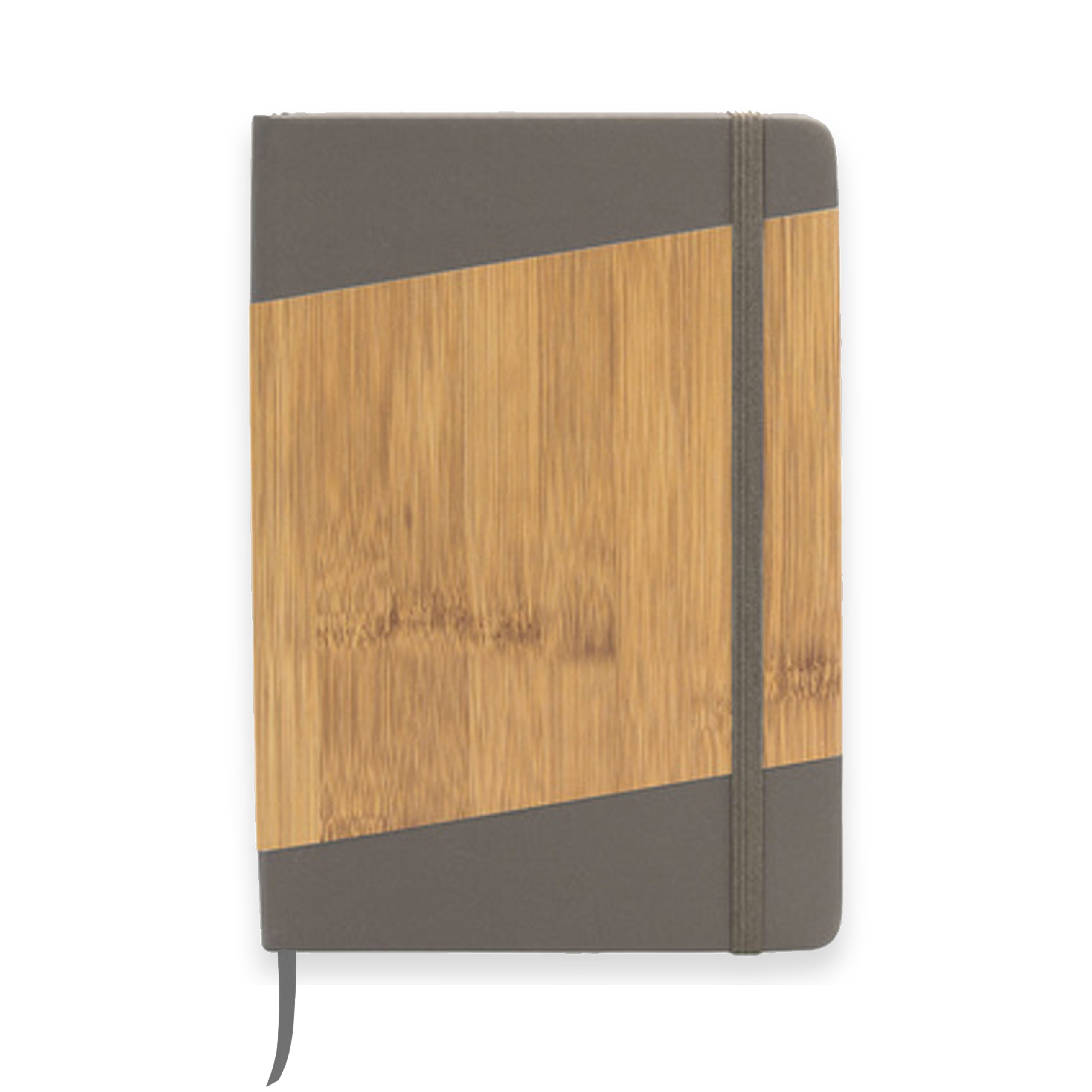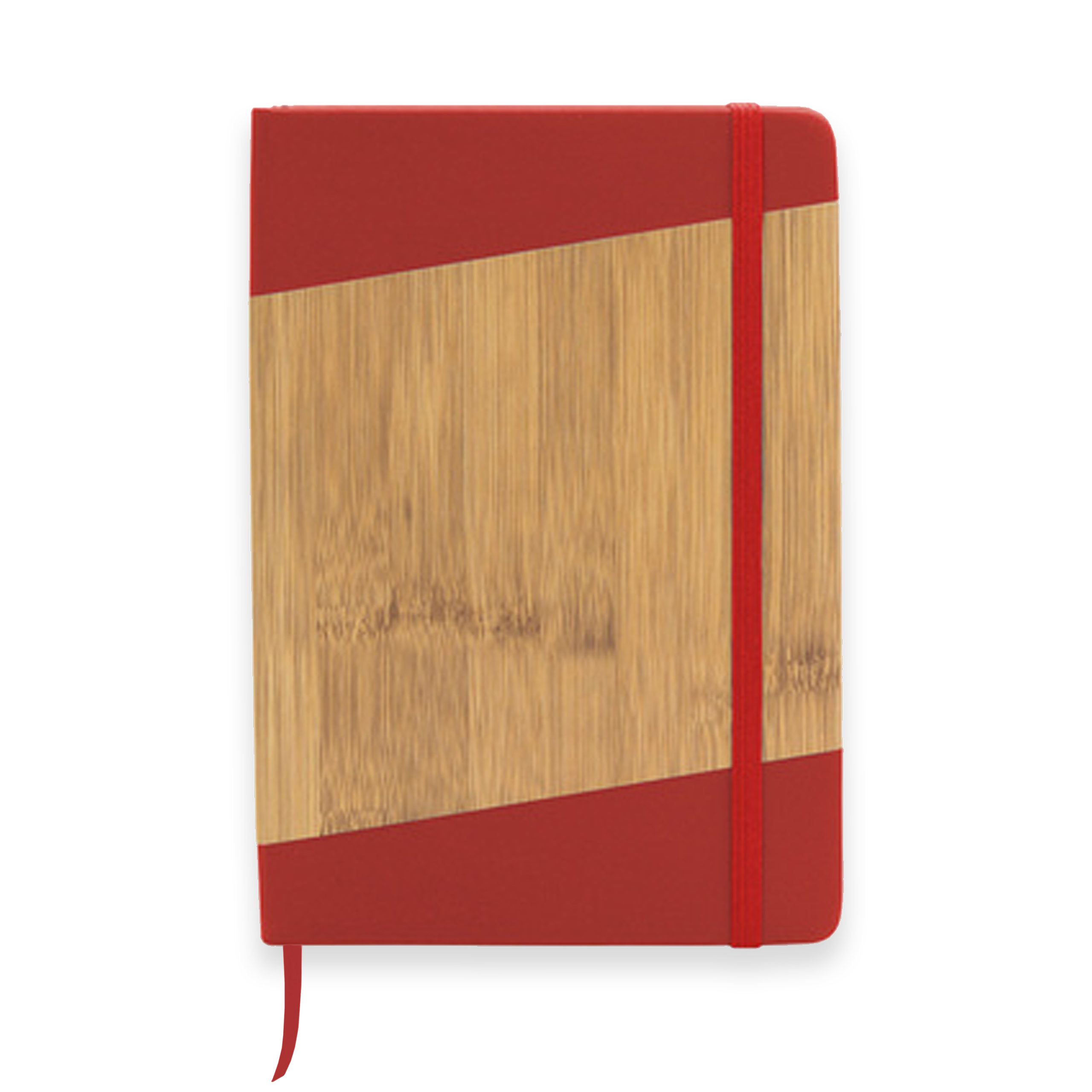 Libreta ecológica con tapa de bamboo, revestimiento de color, marcapágina de cinta y banda elástica del mismo color.