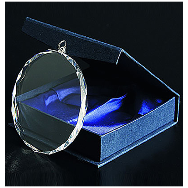 nMedalla de cristal con un alto índice de refracción. Perfecto para grabado láser. Presentación en estuche azul con interior de paño de seda y protección de aislapol.