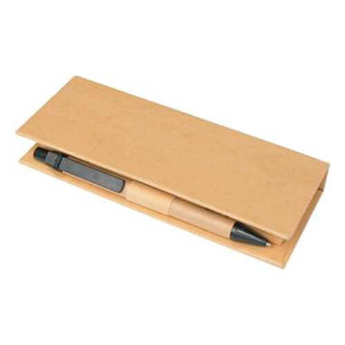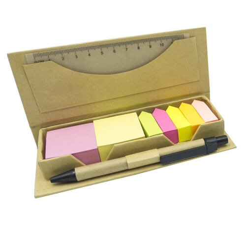 Memo set ecológico de oficina con bolígrafo ecológico, tinta azul, set de post-it y regla.