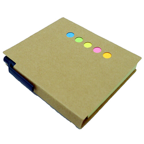 Memo set ecológico de oficina que incluye set de post-it y bolígrafo ecológico pequeño, tinta azul.
