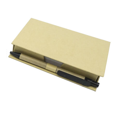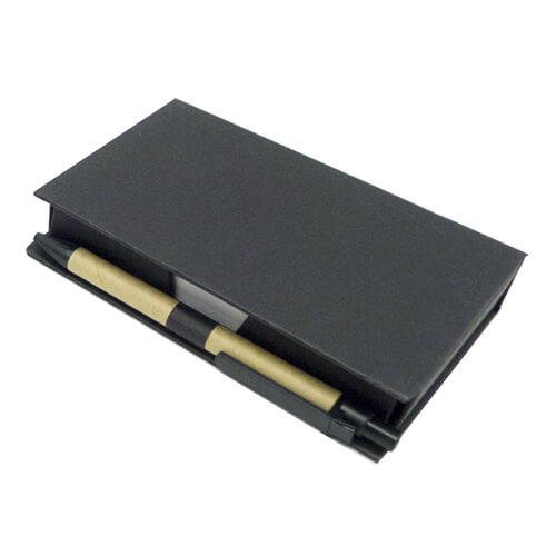 Memo set ecológico rectangular plegable que incluye set de post-it, bloc de notas, regla y bolígrafo ecológico. tinta azul.