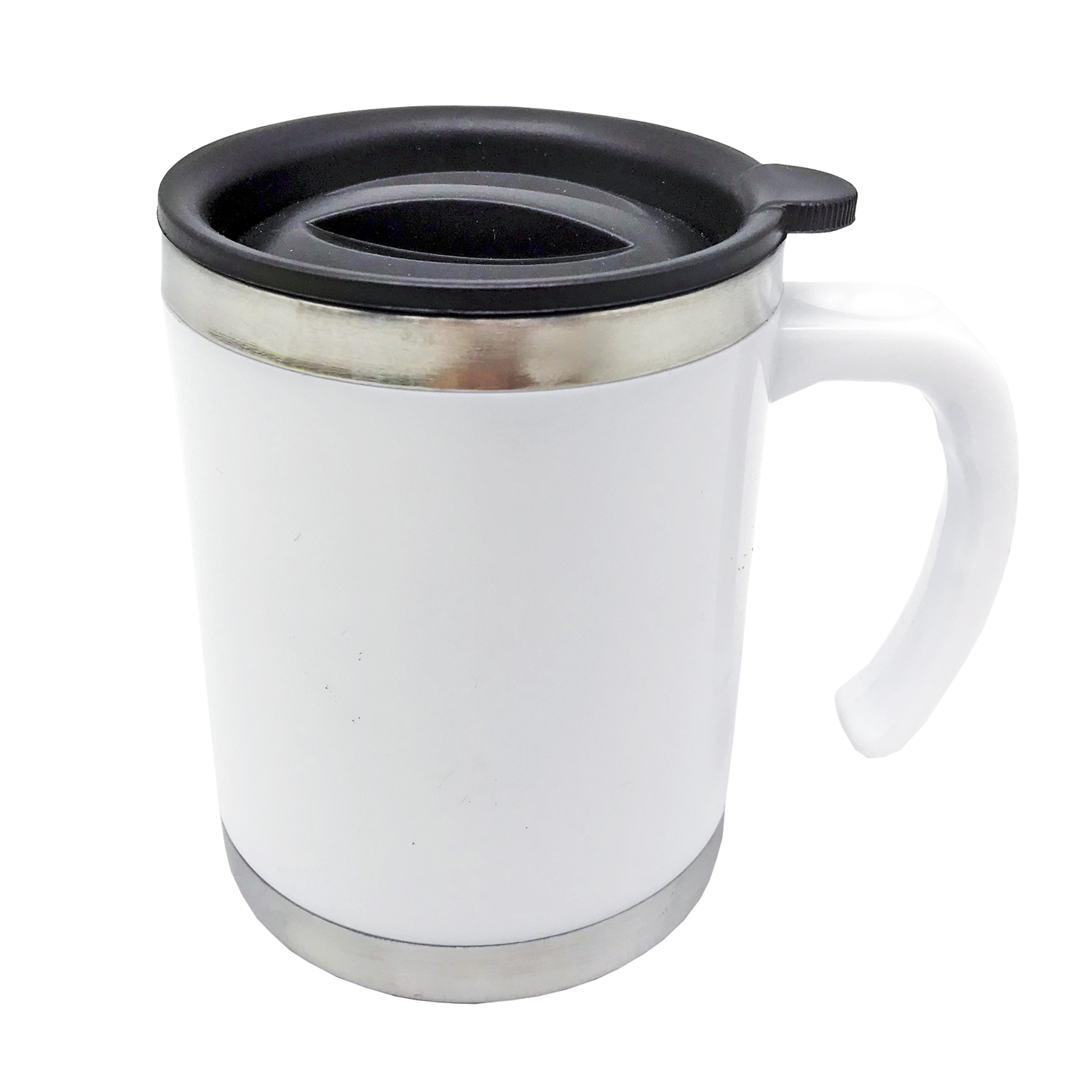 Taza térmica aislada de doble pared con tapa extraíble de PVC negro y dispensador.