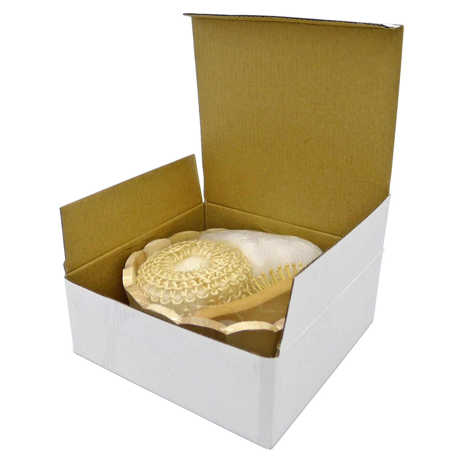 Canasto de madera con un set de artículos de belleza. Incluye esponja malla, cepillo de pelo, esponja de masaje corporal y piedra pómez color blanca.