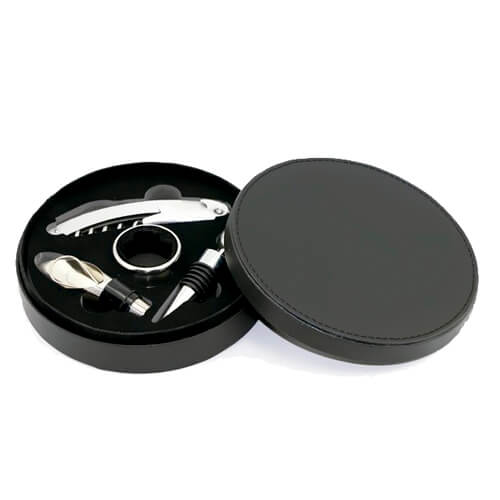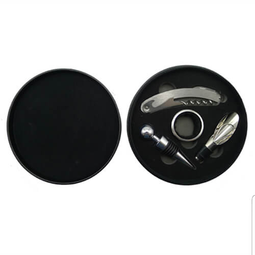 Sacacorchos, argolla anti-goteo, tapón para vino y vertedor de vino.