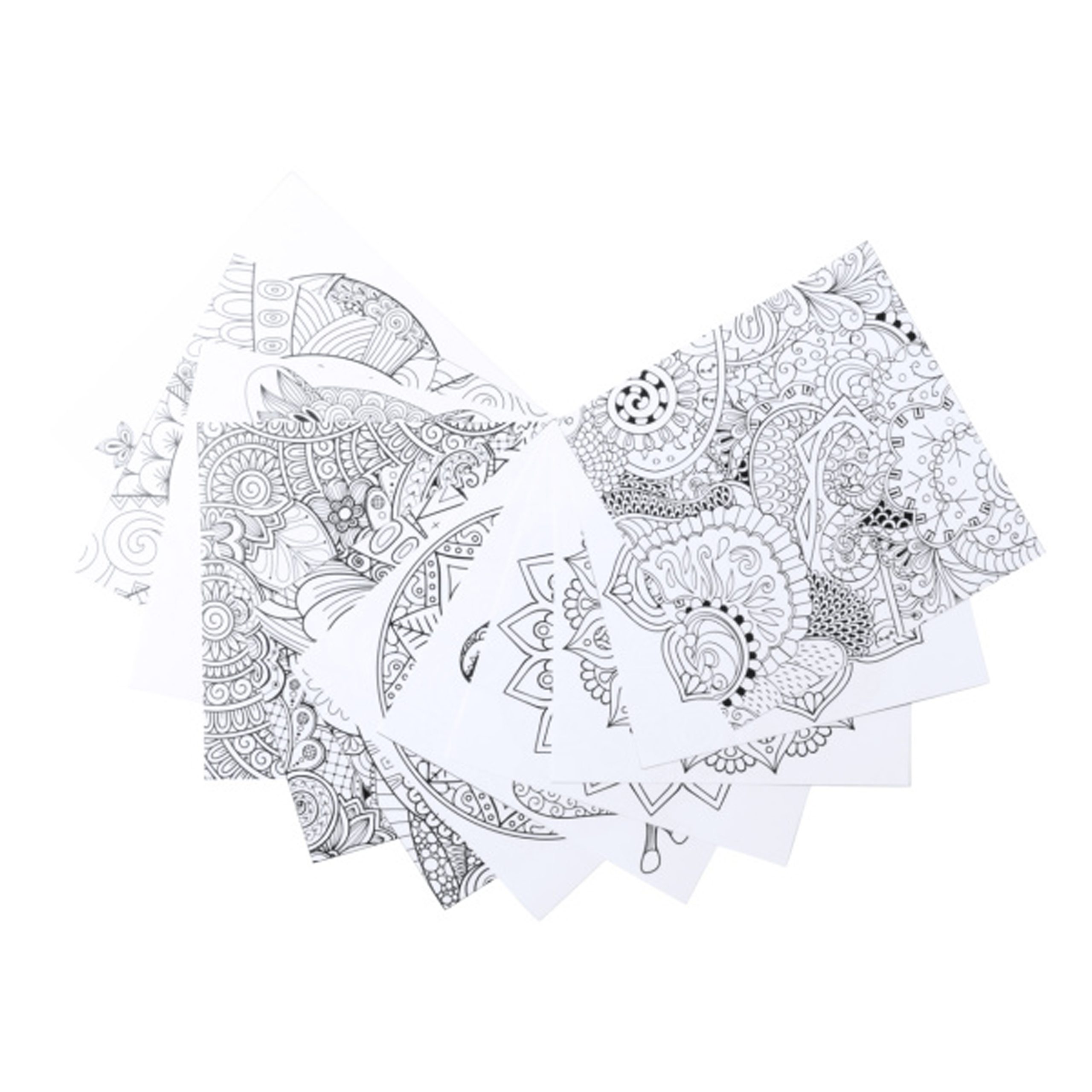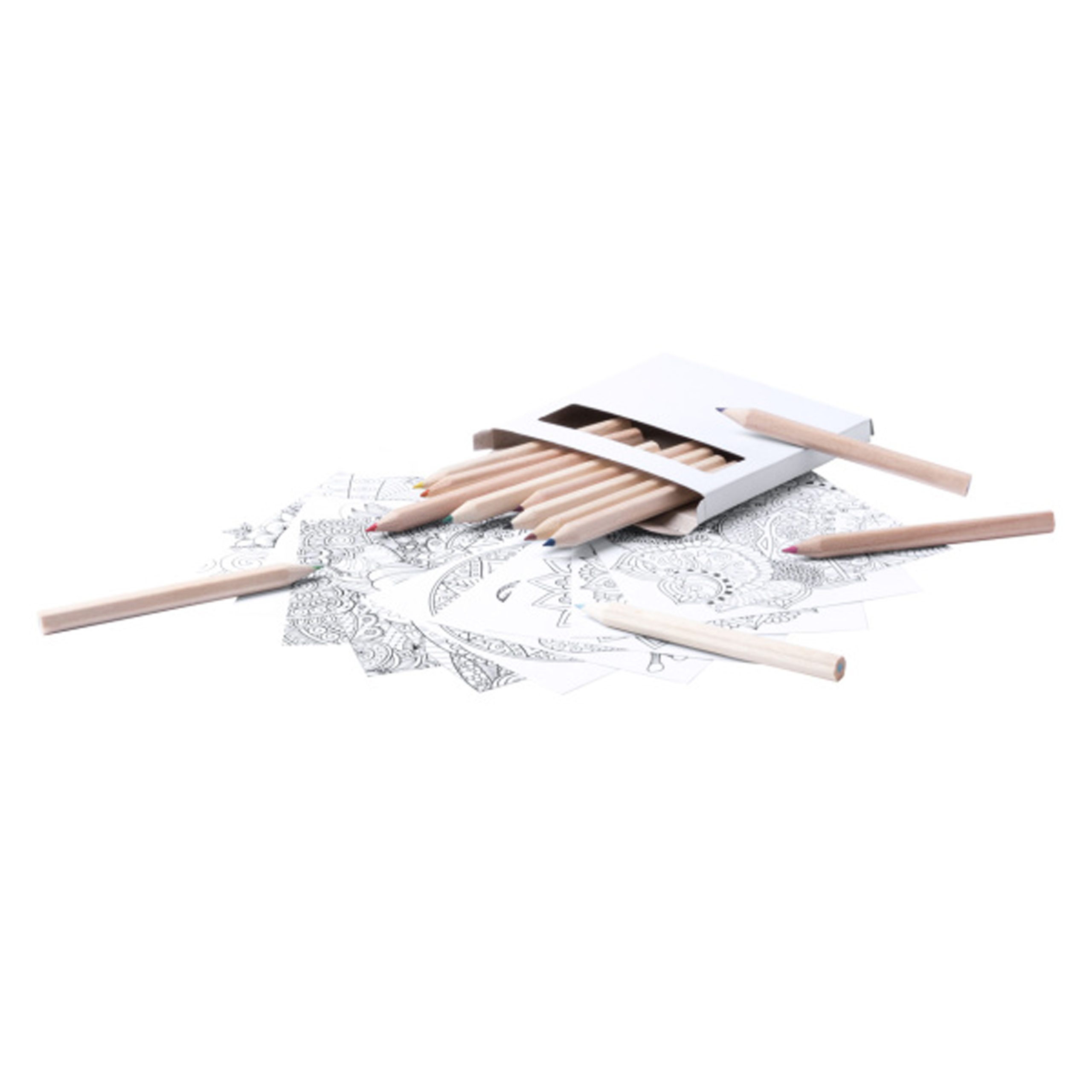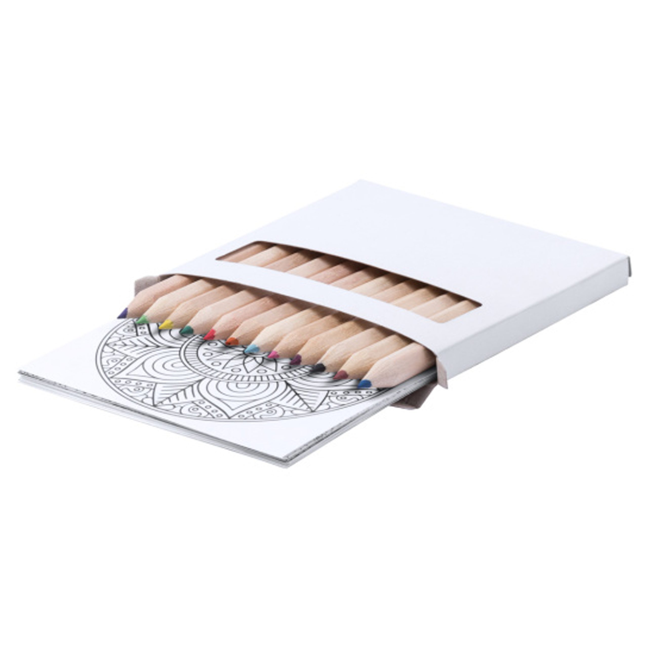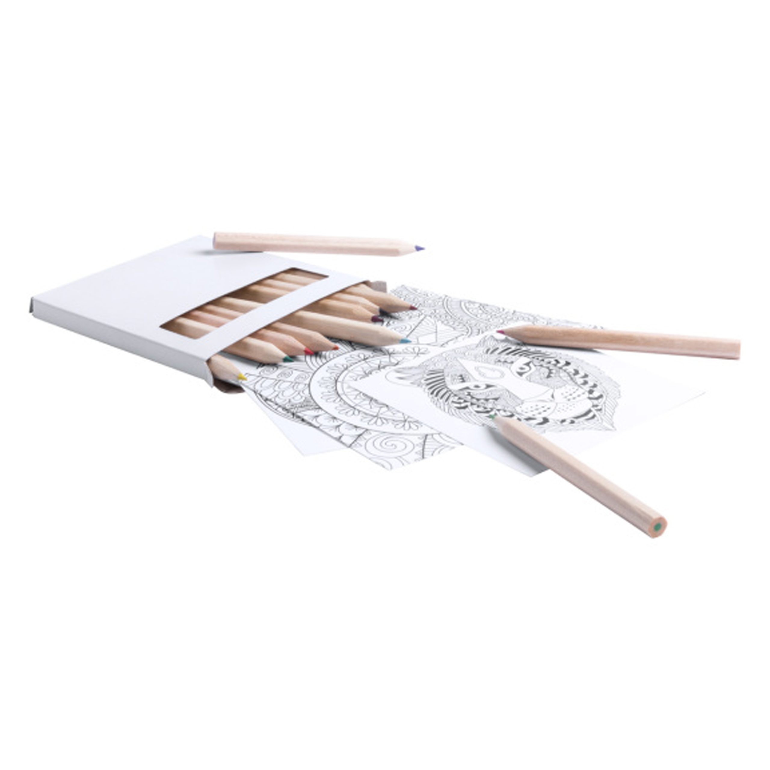 Set de 12 lápices de colores con 12 láminas de mandalas para colorear.