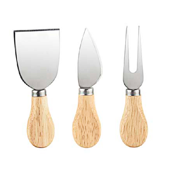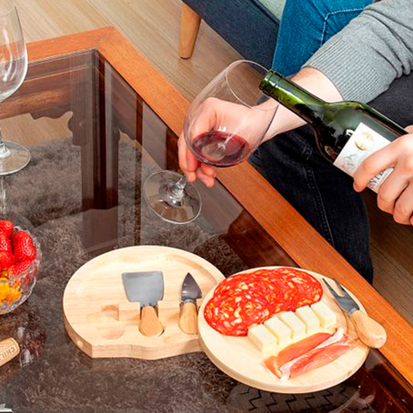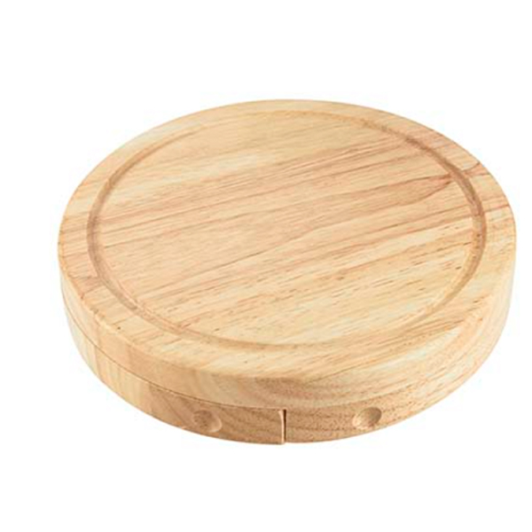 Tabla redonda para picar quesos de madera con herramientas de acero inoxidable y madera roble.