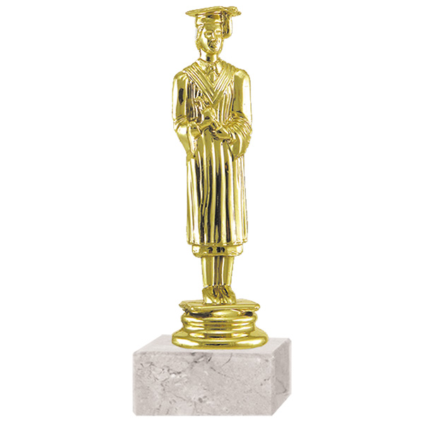 Trofeo plástico de color oro figura graduación femenino. Incluye base de mármol blanca.