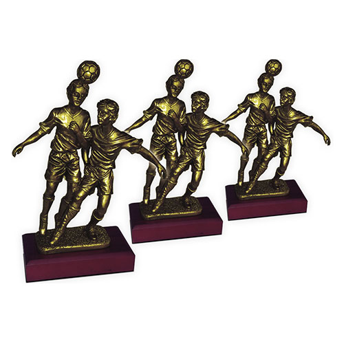 Trofeo de Resina con figura de 2 jugadores pintado de color oro. Incluye base de madera. Presentación en caja de cartón con interior de aislapol.